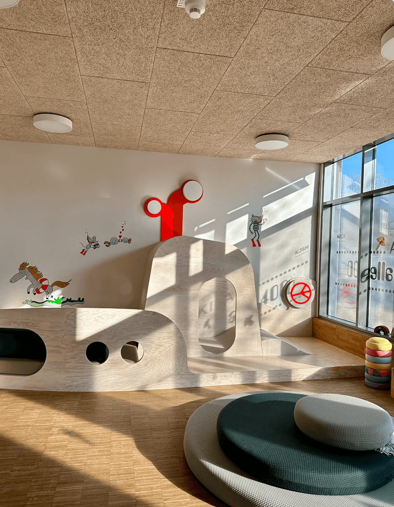 Die moderne Raumgestaltung kombiniert den maritimen, historischen Charme der Werftstadt Kiel mit modernen, skandinavischen Designelementen. So unterstützen begehbare Schiffscontainer und echte Schiffsleuchten die konzeptionellen Schwerpunkte der Flyggerei: ästhetische Bildung, Bewegung und forschendes Lernen.