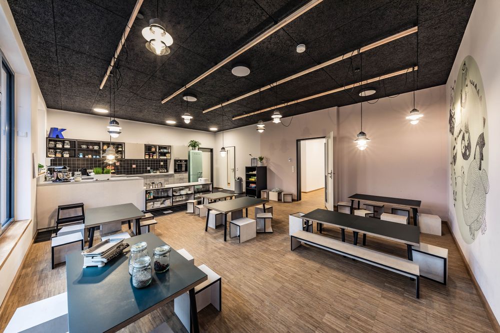 Die moderne und offene Raumgestaltung mit bodentiefen Fenstern weckt die Neugierde schon der Kleinsten und bietet zahlreiche Möglichkeiten zum Entdecken. Funktionsräume für Bewegungs- und Rollenspiele, ein Atelier, ein Konstruktionsraum, eine Bibliothek, ein Bauraum, eine Lernwerkstatt, ein Nestraum, ein Kindercafé zum Essen und Kochen sowie der großzügige Garten laden zum phantasievollen Spielen, Forschen und Kreativsein ein.